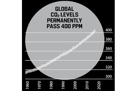 2016 年,有史以来最强大的厄尔尼诺现象之一带来了前所未有的干旱和洪水,这一年也成为有记录以来最热的一年。地球还创下了一个严峻的里程碑:大气二氧化碳浓度达到百万分之 400,甚至包括偏远的南极洲,那里已有 400 万年未见过如此高的二氧化碳含量。气候学家将百万分之 350 视为灾难性海平面上升等可怕后果出现之前的最高阈值。一些地区此前曾在季节性周期中突破百万分之 400,但科学家表示,这一次是永久性的——而且是全球性的。