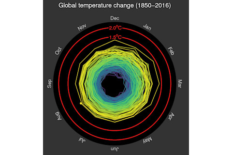螺旋上升 气候学家 Ed Hawkins 有一种看待气温上升的新方法。通过将月份像时钟一样排列,他的图表显示了自 1880 年以来气温上升至 2 摄氏度的螺旋趋势。