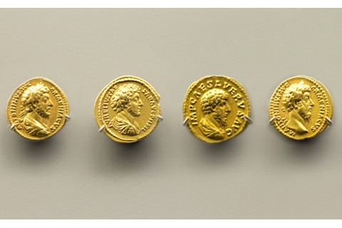 西班牙梅里达罗马国家博物馆珍藏的四枚马可·奥勒留皇帝的金币(图片来源:WH_Pics/SHutterstock)