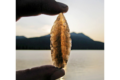 来自阿拉斯加中部的一件黑曜石投掷点,在阳光下逆光拍摄。(图片来源:Andrew Tremayne/美国国家公园管理局)