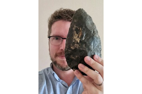 考古科学家埃勒里·弗拉姆手持一件在亚美尼亚出土的黑曜石手斧。(图片来源:由Ellery Frahm提供)