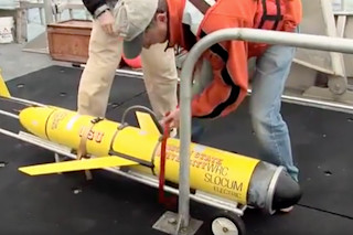 因此,纽约大学海洋学家大卫·霍兰德(David Holland)表示,应该派机器人出马。他与加拿大国家研究委员会(NRC)合作,在格陵兰海岸的一座冰山下部署了一艘五英尺长的自主潜艇。这艘名为Slocum水下滑翔机的潜艇通过单冲程活塞在水中推进,从而将大部分能量用于数据收集。左舷机翼下的传感器测量电导率(以确定水的盐度)、温度和深度,并将数据发送到潜艇内部的处理器。