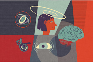 作为医学生,我第一次在解剖实验室看到内耳的陀螺仪时,我被迷住了。它们位于中耳内侧的骨嵴中,三个半规管彼此呈直角,从一个中央囊——椭圆囊——突出,如同超现实主义咖啡杯的把手。内部有一种凝胶状液体,里面充满了对旋转运动敏感的毛细胞。转动头部向左,液体相对于毛细胞顺时针旋转。这会触发左耳的细胞发出更强的信号——而右耳则发出较弱的信号——进入前庭神经,传输到脑干。基本上,左右陀螺仪的信号必须相互补充,才能告诉大脑它正在向哪个方向转动,以便协调全身的肌肉。