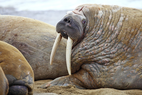 海象的学名(Odobenus rosmarus)的第一个词的意思是“用牙齿走路”,因为它们增大的上犬齿非常大,它们用它们将自己拉上海冰——考虑到成年海象的体重可达两吨,这可不是一件小事。雄性海象的獠牙可达近 40 英寸长——约 3.3 英尺。