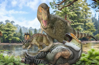 “我们的模型表明,霸王龙的‘祖先’很可能来自亚洲,通过今天的西伯利亚和阿拉斯加之间的白令海峡来到北美,”伦敦大学学院的研究生、该论文的作者之一 Cassius Morrison 在一份新闻稿中说。“这与过去的研究一致,即霸王龙与亚洲的表亲如恐爪龙的关系比与北美的近亲如厚鼻龙更近。”