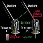 上图:CHARA的六个望远镜共同组成一个集光仪器,其最大口径或基线等于两个望远镜之间的最远距离:1080英尺。Y形配置允许天文学家根据不同的观测改变口径。下图:为了使干涉仪工作,由独立望远镜收集的星光必须同时到达探测器。为了补偿光线到达望远镜2的额外距离,望远镜1收集的光线在延迟线上精确地偏转相同的距离。 图形由马特·赞绘制