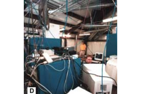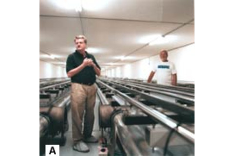(A)CHARA主任哈罗德·麦卡利斯特(左)和场地经理罗伯特·卡德曼站在光学延迟线之间,那里由计算机驱动的推车在50码长的轨道上运行,用于将阵列中每个望远镜的光线传播距离精确到百万分之一英寸以内。