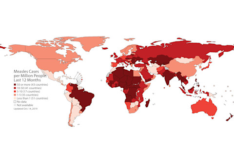 目前,许多报告的病例都与携带病毒从疫情持续的国家返回美国的旅行者有关。在全球范围内,麻疹出现了爆炸性的反弹,2019年前三个月报告的病例比2018年同期增加了300%。截至10月10日,受影响最严重的国家是马达加斯加(127,500例)、乌克兰(56,400例)、印度(53,000例)、菲律宾(39,700例)和尼日利亚(27,000例)。2017年,全球有110,000例麻疹死亡,主要发生在5岁以下的儿童。