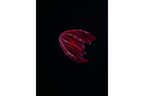 血肚栉水母的深红色胃部据信可以隐藏其最近吞食的发光猎物。与真正的水母不同,栉水母通过成排融合的、毛发状的纤毛(称为栉)在水中滑行。