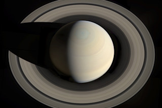 除了看到球体投射在行星环上的惊人阴影外,请注意行星左侧的云层实际上是被行星环反射的光照亮的。这有多酷?