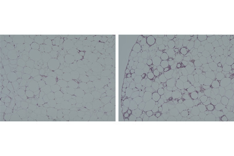 左边是健康、功能正常的脂肪组织,暴露于 FGF21 激素的升高水平下。右边,没有额外 FGF21 的组织显示出炎症和细胞死亡。(图片来源:UT Southwestern)