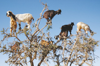 在摩洛哥南部,山羊会爬到 30 英尺高的树梢。秋季,当地面植被稀少时,它们有四分之三的觅食时间都在随处可见的摩洛哥坚果树上。