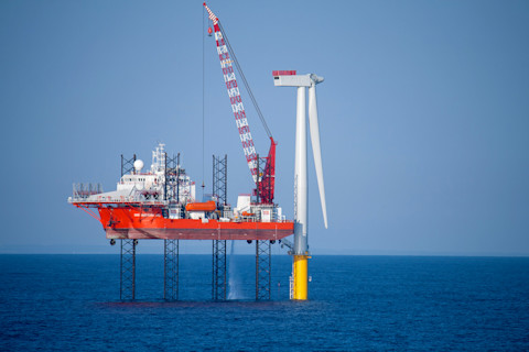 如今的海上涡轮机塔筒内部可以容纳一辆 SUV。运输和安装组件需要专用船只,这些船只变成了稳定的施工平台。(图片来源:; DJ Mattaar/Shutterstock)