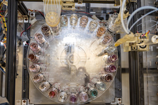 为了探索生命的起源,你可能会尝试制作一个电动转盘,让它24/7不间断运行。至少这是达里奥·卡拉梅利(Dario Caramelli)所采取的方法,他是一名博士后学生,就在克罗宁繁忙的实验室里,距离弗雷不远。“[我们可以]每天运行数千个实验,[因为机器]总是在执行所有步骤,”卡拉梅利解释道,他指出旋转桌面上的机械臂如何在一个盘子里放置化学物质,同时清洗第二个,烘干第三个。一个摄像头监控着内部发生的一切。如果任何供应品用完了,“机器人会发送一封电子邮件。”