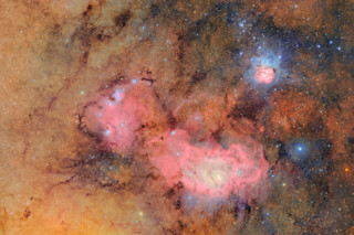 这张图像提供了由 NSF–DOE 维拉·C·鲁宾天文台拍摄的三裂星云和礁湖星云周边区域的近距离观察。三裂星云(也称为梅西耶 20)是位于射手座的一个明亮、色彩斑斓的气体和尘埃云,距离我们约 5,000 光年。它特别引人注目的是在一个地方聚集了各种特征:一个发光的粉红色发射星云、一个凉爽的蓝色反射星云,以及将其分成三个部分的暗尘埃带——因此得名“三裂”。在内部,新的恒星正在形成,并喷射出强烈的风和辐射,吞噬着周围的气体。它让我们对巨型恒星在诞生过程中如何塑造周围环境有了戏剧性的认识。在这张图像中,三裂星云的下方是礁湖星云(或梅西耶 8),另一个充满活力的恒星摇篮,距离我们约 4,000 光年。你甚至可以用一对双筒望远镜或小型望远镜看到礁湖星云。在其核心有一个年轻、巨大的恒星群——它们的强烈辐射照亮了周围的气体,并将旋转的云层塑造成复杂的图案。礁湖星云为科学家们提供了一个研究恒星形成早期阶段的绝佳场所——例如巨型云如何坍塌,星团如何成形,以及新生恒星如何开始重塑它们的环境。(图片来源:NSF–DOE 维拉·C·鲁宾天文台)
