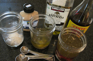 (食谱来自 Ina Garten 的Barefoot Contessa)½ 杯橄榄油 ¼ 杯红酒醋 2 瓣大蒜,切碎 ½ 茶匙第戎芥末 ½ 茶匙黑胡椒粉 1 茶匙盐 1 茶匙干牛至