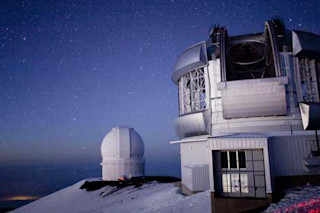 那一刻:夜幕降临在夏威夷莫纳基亚山顶的詹姆斯·克拉克·麦克斯韦尔望远镜(前景)和加拿大-法国-夏威夷望远镜上。詹姆斯·克拉克·麦克斯韦尔望远镜最近捕捉到了第一张系外行星的红外快照,这些行星围绕着一颗距离我们140光年的恒星运行。该望远镜的激光引导星系统使用自适应光学技术,产生超清晰的图像,以补偿地球大气层造成的扭曲。莫纳基亚山是世界上最大的天文台所在地,是一座休眠火山,但不用担心——右侧的红色光芒只是汽车刹车灯。