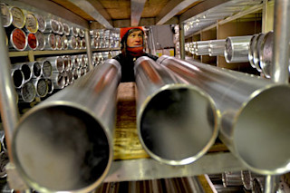埃里克·克雷文斯(Eric Cravens)是科罗拉多州莱克伍德市国家冰芯实验室的助理馆长,他站在一堵铝制冰芯墙后面。这个房间里的冰保持在零下33华氏度(约零下36摄氏度),包含着来自南极洲和格陵兰等不同地区,可追溯到 44 万年前的大气历史快照。“冰芯是某个时期降雪和大气层的极好记录,” 气候学家泰德·斯坎普斯(Ted Scampos)说道,他使用冰芯中的数据进行工作。在冰中发现的灰尘记录了数千年前空气中的物质,无论是火山爆发还是人类活动,雪中氢和氧分子的同位素组成记录了当时的地球温度。一般来说,较重的同位素意味着更温暖的气候。钻取冰芯后,将其干燥、用塑料包裹,然后滑入一个反射阳光的铝制管中。 然后将冰芯迅速运送到冷冻容器中,再运到加利福尼亚州,然后用卡车运到科罗拉多州。它们保存在那里,直到大气科学家、天体物理学家、生物学家和其他研究人员索取样本,以帮助回答我们星球历史上许多未知的问题。