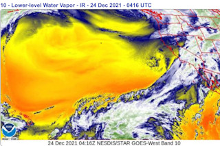 2021年12月24日,一股巨大的水汽流在中低层大气中涌向北美西海岸,正如上方由GOES-West卫星获取的红外图像组成的动画所示。这条大气河流给饱受干旱困扰的加利福尼亚带来了丰沛的降水,包括内华达山脉急需的降雪。根据美国国家海洋和大气管理局的数据,最大的 大气河流 输送的水汽量大约相当于密西西比河河口平均流量的7.5到15倍。