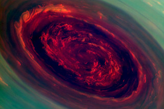 在这张来自美国宇航局卡西尼号探测器的伪彩色图像中,土星北极风暴的旋转涡流看起来像一个巨大的深红色玫瑰,周围环绕着绿色的树叶。图片由美国宇航局/JPL-Caltech/SSI提供 卡西尼号探测器为美国宇航局提供了首次可见光拍摄到的环绕土星北极的巨大天气系统。这个旋转的风暴是地球上平均飓风的 20 倍大。卡西尼号在 2004 年抵达土星后不久,就在土星北极附近一个神秘的、六边形喷射气流内部探测到了一种类似涡流的天气现象,但土星的冬季阻止了任何可见光观测。然而,自 2009 年的春分以来,土星北极接收到的阳光越来越多,照亮了这个类似飓风的系统,科学家们认为它可能已经持续了数年。 http://www.youtube.com/watch?v=HesYzfjQZ5U 这段美国宇航局的视频清楚地展示了该系统的无云眼和逆时针旋转,让人联想到我们地球上的飓风,但它的规模——仅眼部就有 1250 英里宽——和速度,时速 300 英里,都达到了一个更令人印象深刻的规模。美国宇航局的研究人员希望确定该系统是否是飓风,如果是,它如何在土星上有限的水资源下维持自身。视频由美国宇航局提供