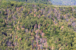 在蒙特雷县梅斯卡尔岭上方的橡树突然死亡病的影响清晰可见。(图片来源:加州橡树死亡工作组) 目前,一种致命的疾病正在北加州肆虐,留下了数百万棵死亡的树木。我们现在无能为力阻止它,但我们本可以。所谓的“橡树突然死亡病”是一种由植物病原体 Phytophthora ramorum 引起的疾病,该病原体与导致爱尔兰马铃薯饥荒的祸害有关。该病造成的破坏规模似乎已超出该地区立法者们的预期,而反击的时机早已过去:根据一项新研究,2002 年是我们扭转局面的最后机会。