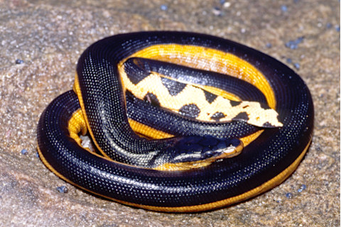 黄腹海蛇可以在世界各地的温暖水域的海洋表面上漂浮。它以其双色外观而闻名——黄色的腹部和深色的上侧。这种蛇有一个特点,就是它是分布最广的海洋蛇类。