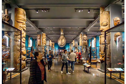 博物馆参观者正在参观美国自然历史博物馆的西北海岸大厅,这里展示了一系列关于太平洋西北海岸文化和文物的展览。该展厅在经过五年的翻修后于2022年重新开放,其中包含与该地区原住民社区共同开发的新展览。(图片来源:Brian Logan Photography/shutterstock)