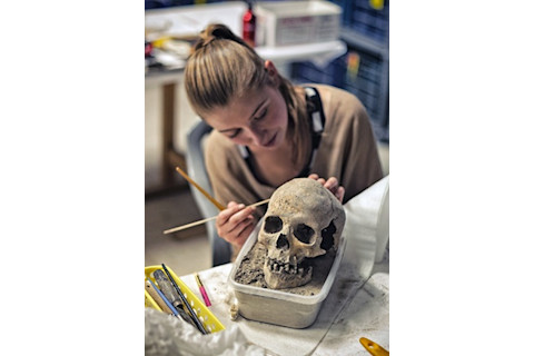 考古学家卡塔日娜·哈拉巴什(Katarzyna Harabasz)在遗址的人类遗骸实验室清理头骨。Scott D. Haddow