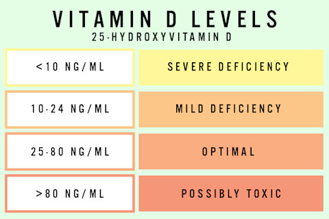 通过血液测量的维生素D水平通常以纳克/毫升(ng/mL)或纳摩尔/升(nmol/L)表示。维生素D的最佳范围被认为是25至80 ng/mL。