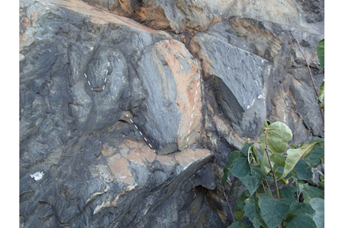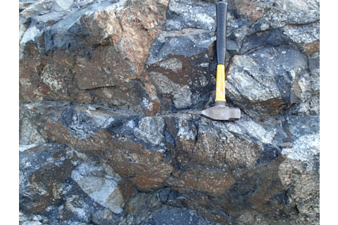 一条黑色的撞击熔体脉切穿了萨德伯里撞击地点附近的地壳。请注意,黑暗的撞击熔体中含有地壳的小块:这是地壳熔化的证据。点击查看大图。