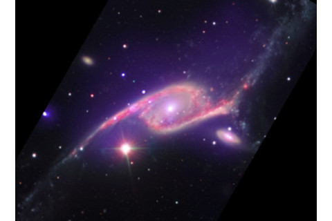 这对星系已被其他望远镜观测过,包括此处的组合图像,它结合了 Spitzer 空间望远镜(观测红外线)、甚大望远镜(可见光)和钱德拉(X 射线)的图像,我已将其旋转以匹配 Gemini 图像并略微缩放。有趣的是,在钱德拉图像中,较小的星系有一个明亮的点源核心,喷射出 X 射线,表明它是一个活动星系,意味着那里的超大质量黑洞正在积极吞噬物质。这在 Gemini 图像中并不明显,因为星系核心中的尘埃隐藏了能量,但 X 射线可以穿透它。天文学家认为 IC 4970 中没有足够的物质来喂养黑洞,所以它一定是正在从更大的星系中剥离冷气体。你可以在这里的两张图像中看到一丝迹象。