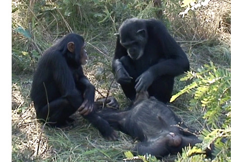 研究人员观察到黑猩猩对死亡有各种各样的反应。图为一只雌性(右)用一根草清理一只已故的雄性(她收养的)的牙齿,而她的女儿在一旁观看。(资料来源:Van Leeuwen, E.J.C. et al. 2017 Scientific Reports)