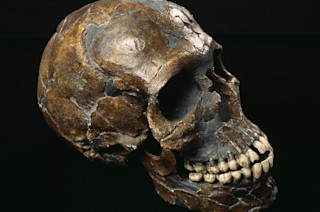 被认为是 Skhul 5 的几乎完整的颅骨和下颌骨是当地出土的 10 位个体的遗骸之一。(图片来源:自然历史博物馆/Alamy Stock Photo)
