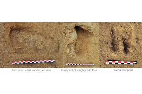 该遗址保存了成年人穿凉鞋的脚印、儿童光脚的脚印以及骆驼的脚印,暗示着一场仪式游行。(来源:Prieto et al. 2019 PLoS ONE)