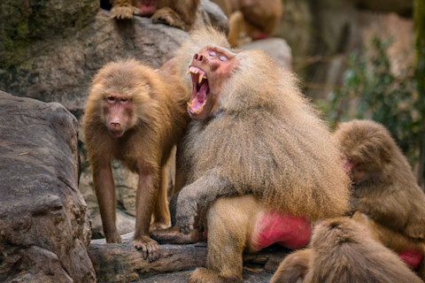一只成年雄性狒狒露出牙齿。(图片来源:CherylRamalho/Shutterstock)