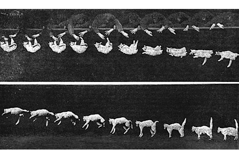 1882 年,法国科学家 Étienne-Jules Marey 开发了一种名为计时摄影术的技术,并用它以每秒 12 帧的速度拍摄了下落猫的照片。结果图像清楚地表明,猫可以在空中调整姿势,而无需推任何东西。当 Marey 于 1894 年在法国科学院会议上展示他的发现时,反响非常强烈。这似乎意味着 Marey 提供的证据与物理定律相悖。
