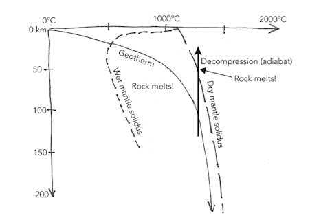 这张草图说明了地球上的岩石为何会融化。地温线(实线)表明岩石不应融化,因为它从未越过干地幔固相线(仅通过加热即可使地幔岩石融化的点)。加水后,固相线会移至湿地幔固相线(短虚线)。在恒定温度下减压地幔,会使地幔在上升时越过固相线(粗实线)。更多详情请参见正文。图片:Erik Klemetti 问题始于“如何融化一块岩石?”你可能会想到的最直接的方法是“提高温度!”这正是冰的情况——它是固体水,当温度超过0ºC/32ºF时就会融化。然而,对于岩石来说,我们遇到了一个问题。地球实际上没有足够的热量来融化地幔岩石,而地幔岩石是洋中脊、热点和俯冲带玄武岩的来源。如果我们假设融化的地幔是由二辉岩*构成,那么固相线(岩石开始熔化的点)在200公里深度(上地幔)处约为2000ºC。现在,地球的地温梯度(深度越深温度越高;见上文)模型表明,当你穿过地壳到达上地幔时,200公里处的温度在1300-1800ºC之间,远低于二辉岩的熔点。那么,如果向上温度更低,为什么这些二辉岩会融化形成玄武岩呢?嗯,这需要你停止考虑如何加热岩石使其熔化,而是考虑如何改变岩石的熔点(固相线)。想想我们的冰的类比。在冬天,你有很多时候想摆脱那