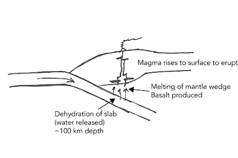 描绘俯冲带熔融的草图。俯冲板块在深度处释放水分,加热后导致上方地幔部分熔融,形成玄武岩。图片:Erik Klemetti 冰,但当时的 ambient 温度低于空气温度。那么,你该怎么办?一种方法是通过破坏H2O分子之间的键来在较低温度下融化冰——从而阻止坚硬的冰的形成。盐是破坏这一点的绝佳方法,所以往冰上撒些NaCl或KCl,它就会在低于0ºC的温度下融化。对于岩石来说,水就像盐一样。将水添加到地幔二辉岩中,它会在较低的温度下融化,因为构成岩石的矿物中的键会被水分子(我们称之为“网络改性剂”)破坏。在俯冲带(如喀斯喀特山脉或安第斯山脉),其中一个海洋板块在另一个板块下滑,那个俯冲的板块在加热时会释放出水分。然后,这些水会上升到它上面的地幔,导致地幔在较低的温度下融化,然后!在称为