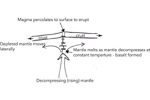 描绘洋中脊减压熔融的草图。温暖、肥沃的地幔上升,部分熔融形成玄武岩,然后随着冷却远离洋中脊。图片:Erik Klemetti 等一下!地球上最大的火山系统是洋中脊系统,那里没有任何俯冲作用将水带入地幔以帮助熔融。那么,为什么那里会有玄武岩呢?这次我们必须使用另一种方法来融化二辉岩——我们需要在恒定温度下对其进行减压。这被称为绝热上升。地幔在对流,将地幔从深处带到地表,并且随着它的移动,地幔物质保持高温,比周围岩石更热。二辉岩的熔点(固相线)随压力变化,因此200公里处的2000ºC熔点在50公里处仅为~1400ºC。所以,保持地幔物质高温并对其进行减压,你就会得到熔融形成玄武岩!因此,在洋中脊下方(以及像夏威夷这样的热点),地幔正在上涌,导致减压熔融发生。让我们回顾一下:在正常条件下,上地幔中的二辉岩等地幔岩石不应融化——它太冷了。然而,通过加水可以降低岩石的熔点。或者,通过对岩石进行减压,可以将其带到固相线较低的压力。在这两种情况下,都会形成玄武岩浆,考虑到它比周围岩石更热、密度更低,它会渗入地表……其中一些会喷发!*地幔绝不是均质的,但对我们来说,我们感兴趣的是所谓的“肥沃地幔”——也就是说,未经熔融且能够产生玄武岩液体的地幔。