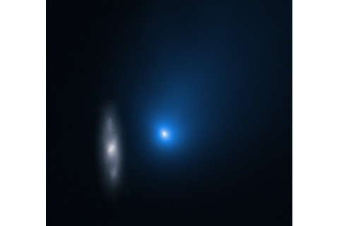 在 2019 年 11 月拍摄的哈勃太空望远镜图像中,2I/Borisov 在一个遥远的旋涡星系(左)前呈现为一个模糊的蓝点,当时该天体距离地球约 2 亿英里。图片来源:NASA, ESA, AND D. JEWITT (UCLA)