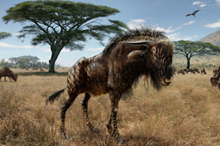 艺术家对Rusingoryx atopocranion的想象。 (图片来源:Todd S. Marshall) 很难想象,来自冰河时代的毛发蓬乱的羚羊会与在白垩纪(1.45 亿至 6600 万年前)漫游的一群恐龙有什么共同之处。但是,科学总是充满惊喜。Rusingoryx atopocranion,一种与现代角马相关的已灭绝物种,与一群鸭嘴龙共享一种奇特的适应特征:面部前部一处被称为鼻嵴的空心、圆顶状骨嵴。古生物学家表示,一头具有鸭嘴龙类物种那样骨质鼻嵴的更新世羚羊,是所谓的趋同进化的一个令人惊讶的例子。