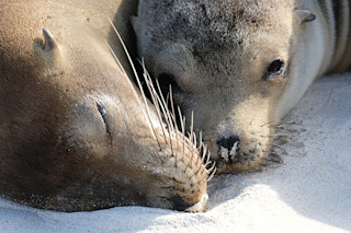 如果上图中加拉帕戈斯群岛的母幼海狮看起来很满足,可能是我们简单地将人类情感投射到它们身上。或者也可能只是因为它们的肚子装满了鱼。