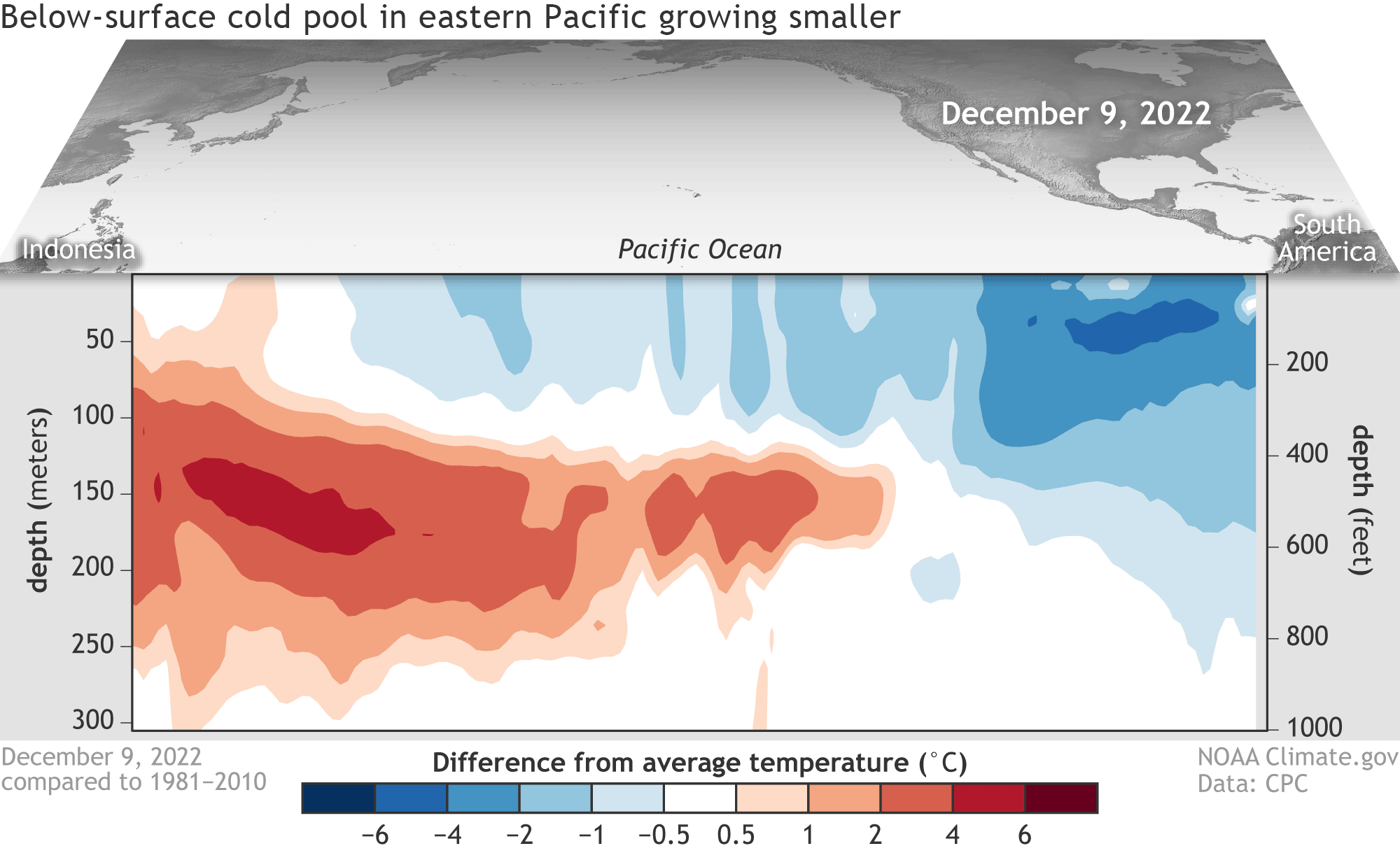 这幅动画描绘了2022年12月至2023年1月热带太平洋前300米(约1000英尺)水温与平均值的偏差。在太平洋东部横截面中看到的巨大冷水团正在缩小。这可能预示着从拉尼娜的寒冷条件向中性气候状态的过渡。(图片来源:NOAA Climate.gov 动画,基于NOAA气候预测中心的数据)