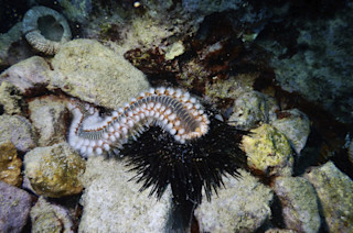 海胆的咀嚼器官是一个叫做亚里士多德提灯的复杂器官。科学家们看到一只蠕虫抓住这个结构,并将其完全吸食干净。然后,蠕虫会爬进它制造的洞里,从内部吃掉海胆。